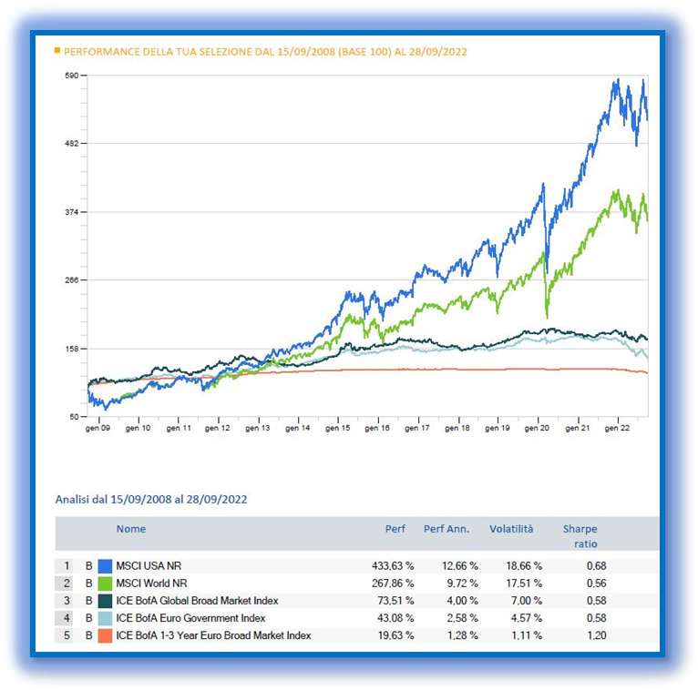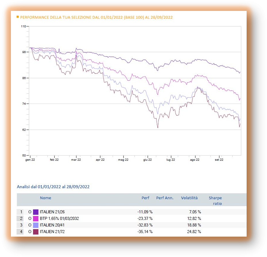Insomma, col senno del poi, il 2008 si è rivelato una grandissima occasione di acquisto (così come lo è stato il tremendo periodo del Covid-19); periodi molto probabilmente irripetibili o forse no, se si impara dal passato; anzi, in questo momento c’è una doppia opportunità visto che il mercato obbligazionario sta conoscendo una delle più profonde perdite di sempre e questo grafico sull’andamento di alcuni BTP, da inizio anno, ne è una drammatica testimonianza.